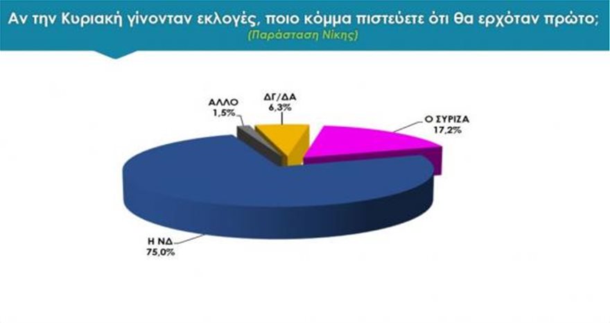 Η δημοσκόπηση που διενεργήθηκε για λογαριασμό του in.gr δείχνει επίσης μια συντριπτική υπεροχή της ΝΔ στην παράσταση νίκης. Συγκεκριμένα, η ΝΔ προηγείται με το συντριπτικό 75% και ο ΣΥΡΙΖΑ συγκεντρώνει ποσοστό 17,2%.