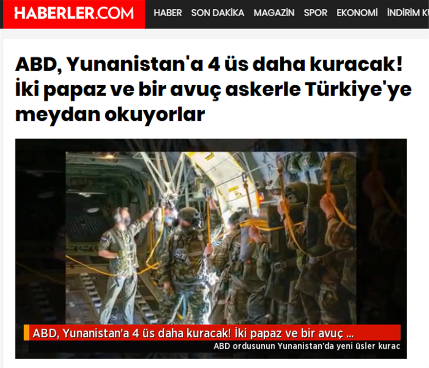 Γράφει μεταξύ άλλων το haberler.com: «Παρουσιάστηκε στον τύπο το ότι ο αμερικάνικος στρατός θα στήσει νέες βάσεις στην Ελλάδα. Ο αμερικανικός στρατός που θα εγκατασταθεί σε τέσσερις ακόμη βάσεις έκανε άσκηση στην Καβάλα πού βρίσκεται κοντά στη δυτική Θράκη. Εντύπωση προκάλεσε ότι στις φωτογραφίες από την άσκηση μεταξύ των στρατιωτών υπάρχουν και παπάδες. Ως λόγος της προτίμησης των ΗΠΑ προς την Ελλάδα προβλήθηκαν τα προβλήματα στις σχέσεις μεταξύ Τουρκίας και ΗΠΑ» αναφέρει.