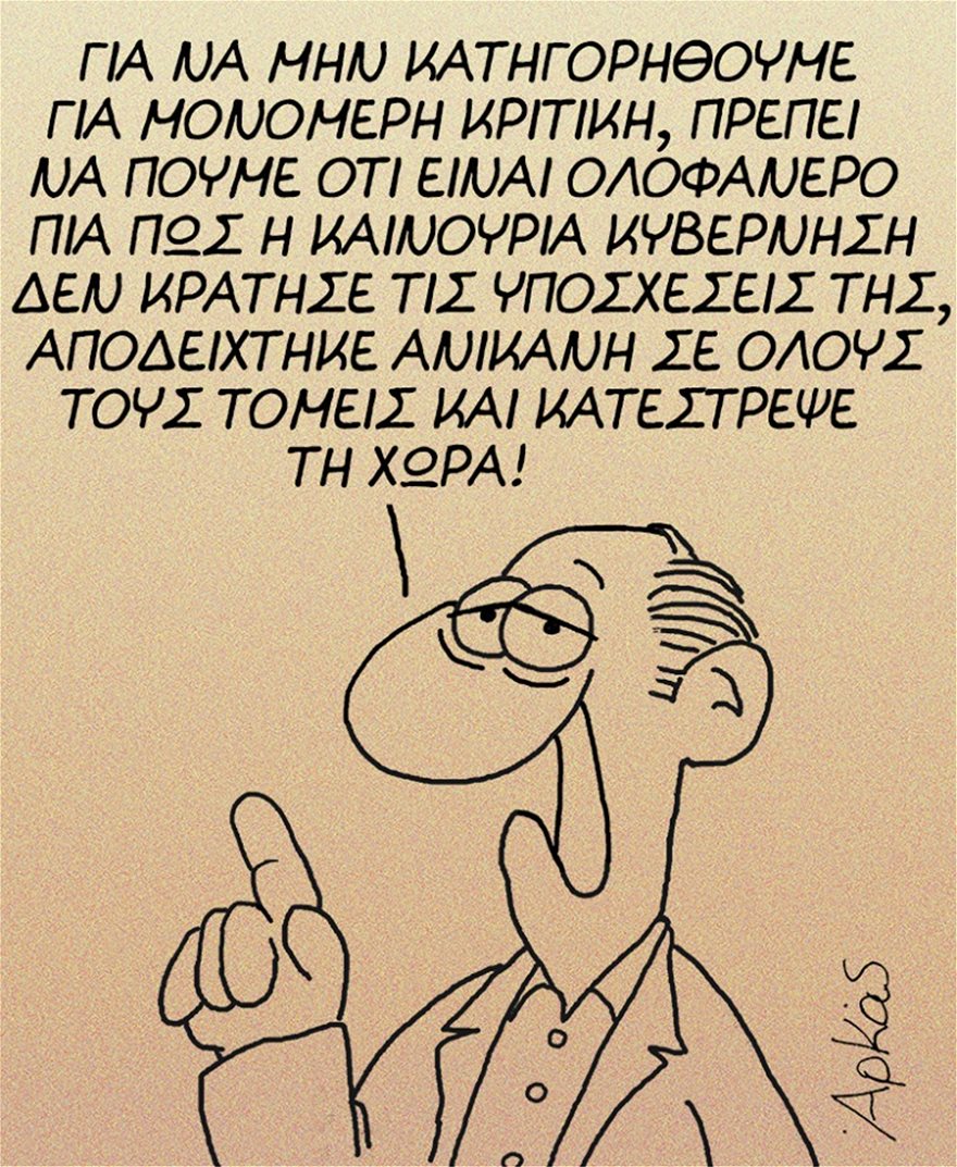 Στο νέο του σκίτσο ο Αρκάς αναφέρει χαρακτηριστικά πως «για να μην κατηγορηθούμε για μονομερή κριτική, πρέπει να πούμε ότι είναι ολοφάνερο πια πως η καινούργια κυβέρνηση δεν κράτησε τις υποσχέσεις της, αποδείχθηκε ανίκανη σε όλους τους τομείς και κατέστρεψε τη χώρα»!.