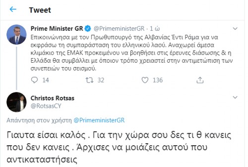 Παράλληλα ο κος. Μητσοτάκης δήλωσε την ετοιμότητα της Ελλάδας για την παροχή άμεσης βοήθειας στη σεισμόπληκτη Αλβανία.
