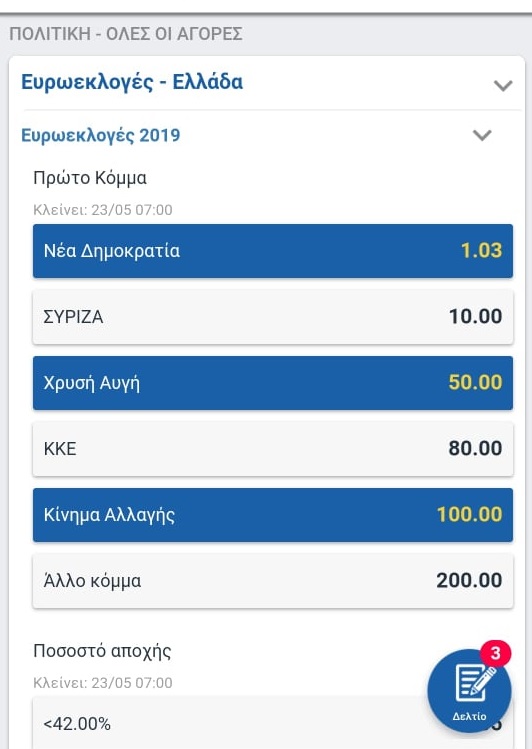 Καθαρή νίκη της ΝΔ προβλέπουν οι εταιρίες στοιχήματος. Σύμφωνα με την εταιρία stoiximan οι αποδόσεις των πολιτικών κομμάτων για την πρώτη θέση είναι:
