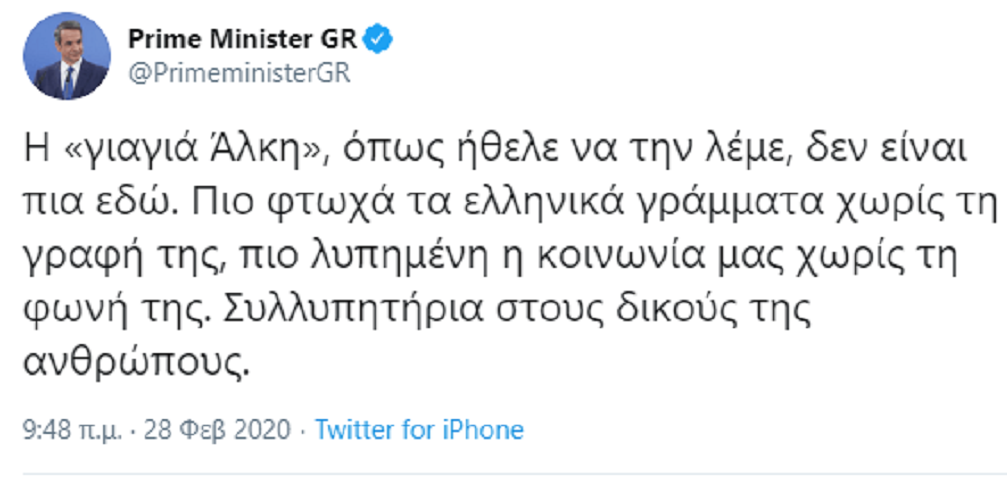 Την Άλκη Ζέη αποχαιρετά, με τον δικό του τρόπο, ο πρωθυπουργός Κυριάκος Μητσοτάκης.