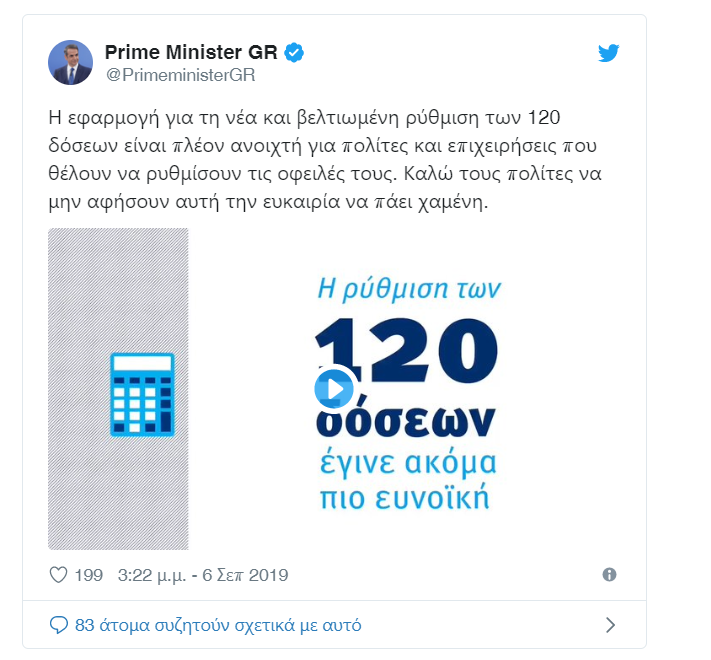 Με ανάρτησή του στο Twitter, ο πρωθυπουργός Κυριάκος Μητσοτάκης καλεί τους φορολογούμενους που έχουν οφειλές στην Εφορία, να σπεύσουν να εκμεταλλευτούν τις ρυθμίσεις για τις 120 δόσεις.