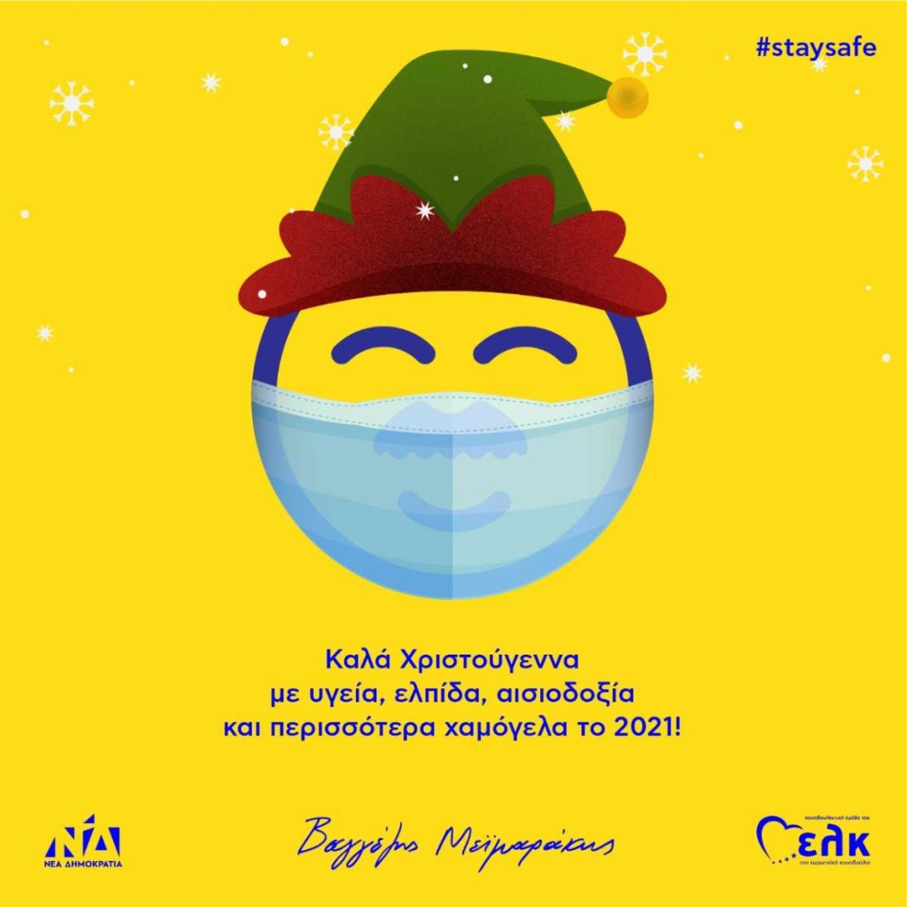 Φέτος η ευχητήρια κάρτα του κ. Μεϊμαράκη είναι προσαρμοσμένη στην εποχή covid 19 αφού η καθιερωμένη φατσούλα φορώντας μάσκα εύχεται «Καλά Χριστούγεννα με υγεία, ελπίδα και αισιοδοξία και περισσότερα χαμόγελα το 2021».