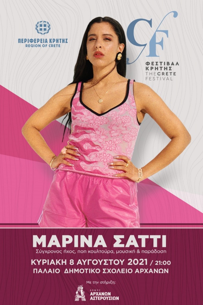 Με τη διοργάνωση της Περιφέρειας Κρήτης συνεχίζεται με επιτυχία το «Φεστιβάλ Κρήτης» με τη συναυλία της Μαρίνας Σάττι. Η συναυλία θα φιλοξενηθεί στο Παλαιό Δημοτικό Αρχανών, την Κυριακή 8 Αυγούστου 2021 και ώρα 21.00.